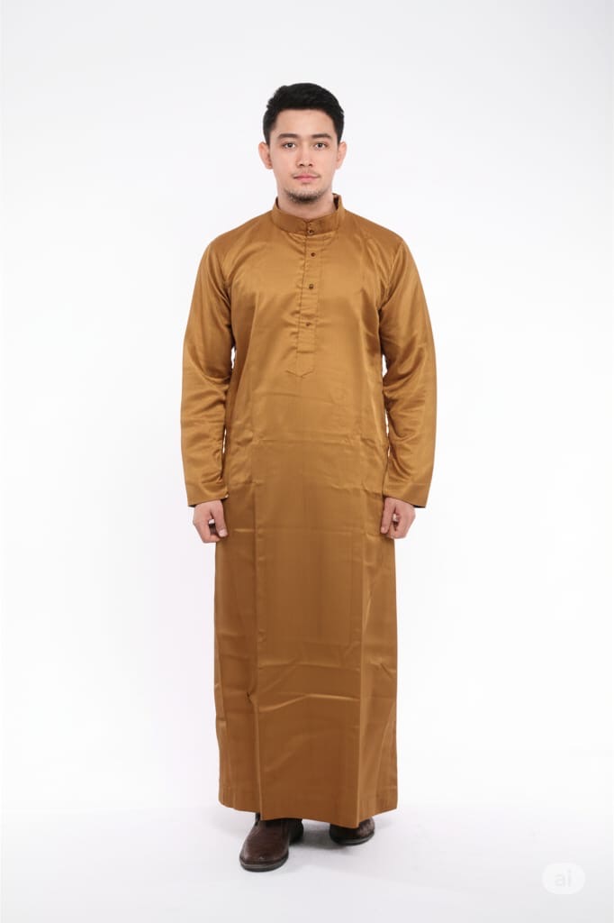 This traditional gold thobe, also known as a dishdasha or kandura, is a perfect blend of classic style and modern sophistication. Crafted from a smooth, lustrous fabric, it offers a comfortable and dignified look for any formal or celebratory occasion.