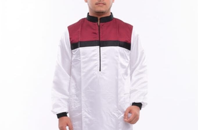 Men’s White Muslim Thobe with Maroon and Black Color Block Chest