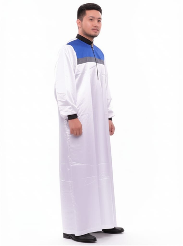 Sporty & Stylish Men’s Thobe / Kandura This modern men’s thobe, also known as a kandura or dishdasha, redefines traditional wear with a sporty and contemporary twist. The clean white body is complemented by a bold, color-blocked chest panel, making it a unique and fashionable choice for the modern man. Key Features: * Dynamic Color-Block Design: A striking combination of blue, grey, and black on the chest and collar adds a fresh, athletic feel to the classic thobe silhouette. * Quarter-Zip Closure: The practical quarter-zip design offers a modern look and easy wear. * Comfortable Fit: Made from a lightweight, breathable fabric, it provides all-day comfort and freedom of movement. * Elasticated Cuffs: The black elasticated cuffs on the sleeves add to the sporty aesthetic and provide a secure fit. * Versatile Occasions: Perfect for casual outings, daily wear, or occasions where you want to blend tradition with a modern, laid-back style. * Easy Care: Durable fabric that is simple to wash and maintain. Step up your style with this unique and comfortable thobe that perfectly marries tradition with contemporary sportswear design.